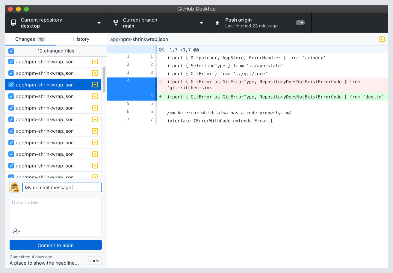 GitHub Desktop is a git workflow tool built on Electron. It's available on both macOS and Windows and was designed to feel like a native application, considering the core differences between the two platforms. It's meant to look platform agnostic and neutral, rather than mimicking the Primer styles used on github.com. These guidelines cover the basic principles and foundation elements to consider when designing for Desktop.